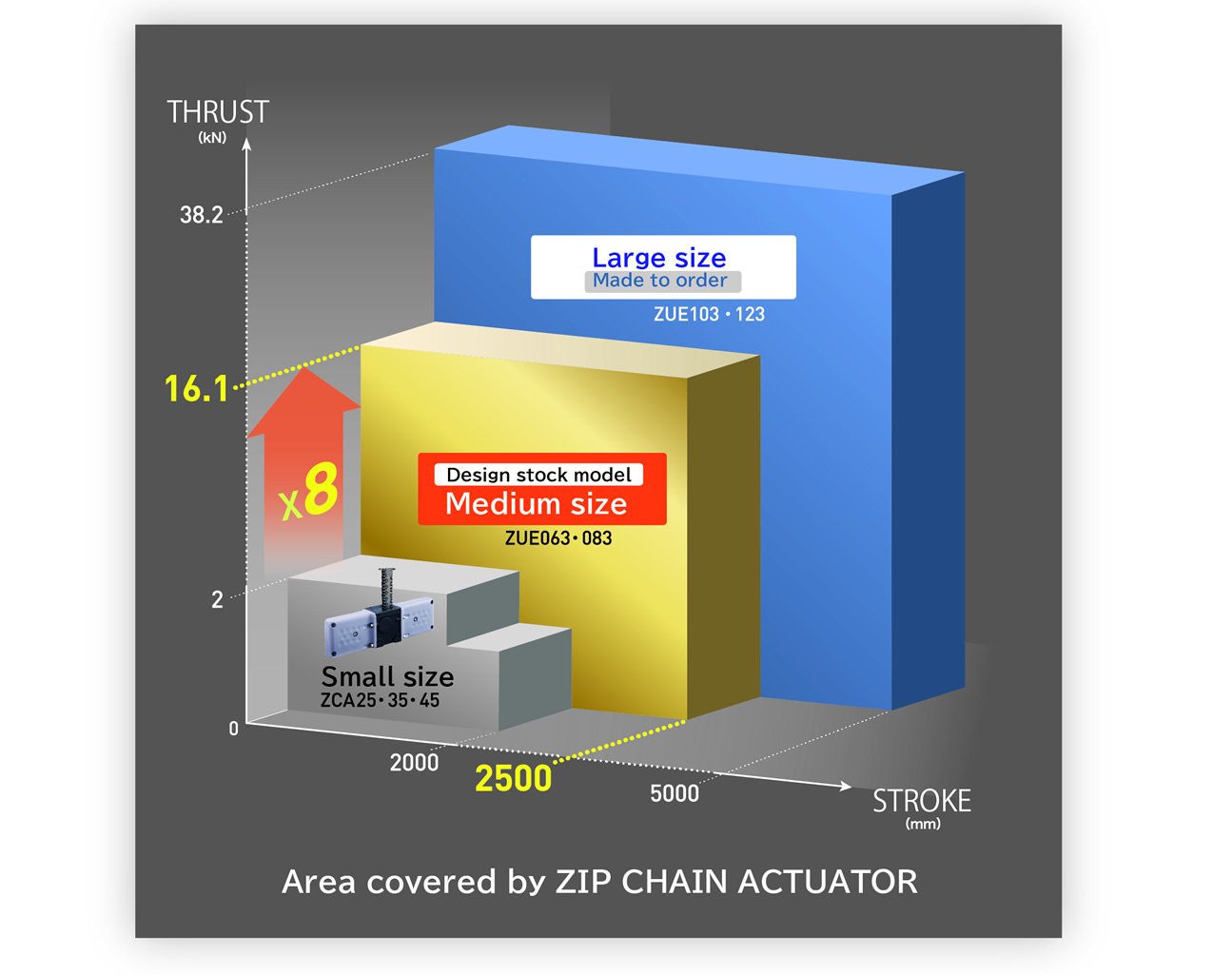 Medium/Large size Zip Chain Actuator with significantly expanded thrust and stroke ranges are now available.