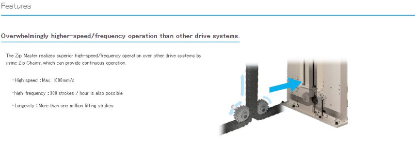 High-speed lifting of up to 1000 mm / s (60 m / min) is possible.
